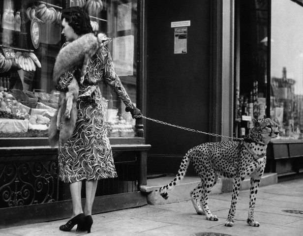 August 1939, London, England, UK — Pet Cheetah Goes Shopping — Image by © Hulton-Deutsch Collection/CORBIS