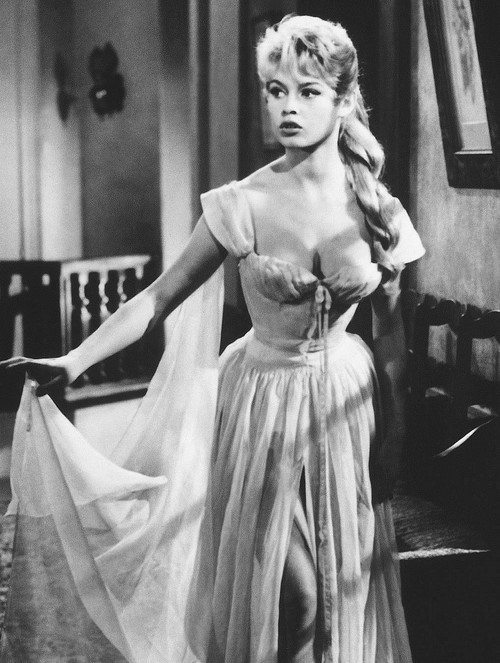 Die Braut war viel zu schön (La marriee est trop belle, FR 1956, Regie: Pierre Gaspard-Huit) Brigitte Bardot / junge Frau, durchsichtiges Nachthemd, Chiffon, Blondine, blond, Dekollete, Schmollmund, Sexsymbol, sexy, erotisch, Erotik, BB, B.B.